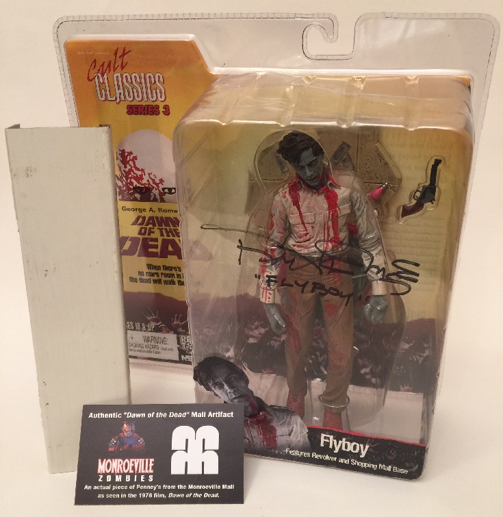 This deluxe combo pack includes a NECA Dawn of the Dead 7 inch Flyboy action figure in sealed NECA clamshell PLUS one 7 1/2 actual elevator door steel piece as seen in the film on the actual elevator. The figure's clamshell package is autographed by David Emge, the actor who played Flyboy. The combo package includes two certificates of authenticity, one limited edition numbered authenticating the actual elevator door piece and one authenticating the combo pack to include the pieces as listed here and the authenticity of the autograph. The entire combo pack is beautifully packed in another outer clamshell displaying all contents (packaged signed figure, door piece, and both COAs).
