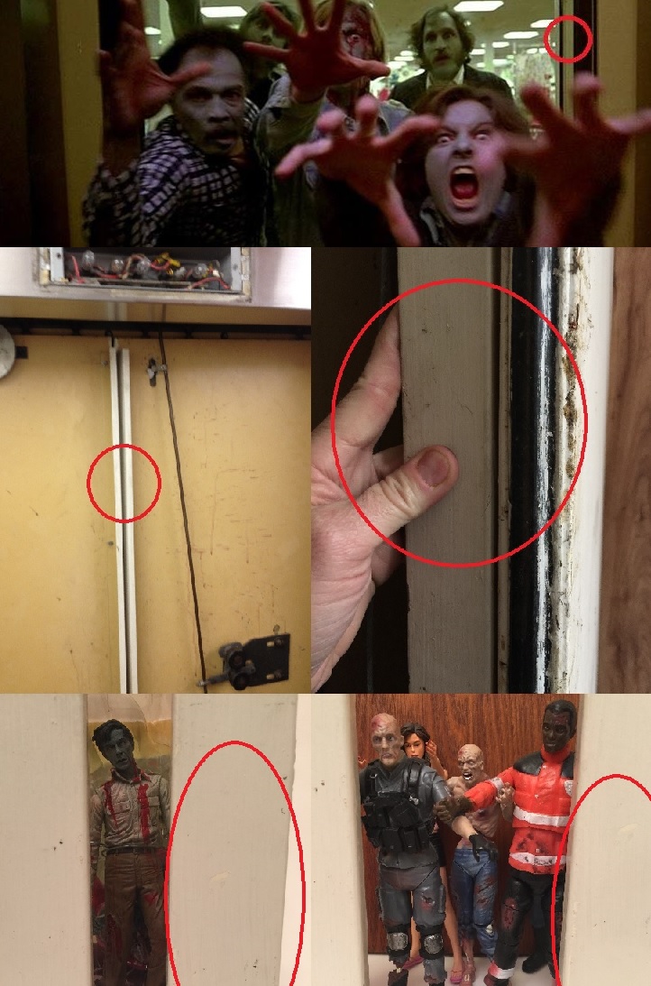 The climatic scene in Dawn of the Dead takes place in the JC Penney Elevator when the doors open to reveal Flyboy Zombie! Monroeville Zombies purchased and removed the actual elevator doors from JC Penney (inset picture) for a future exhibit in the zombie museum.The doors each have an inner edge that is visible in the film when the doors are shown open. The edge piece happens to be a width that is in scale if used as a door for the Dawn of the Dead 7 inch scale action figures. The edge piece has been cut to 7 1/2 inches long to also be in height scale as a door for action figures.