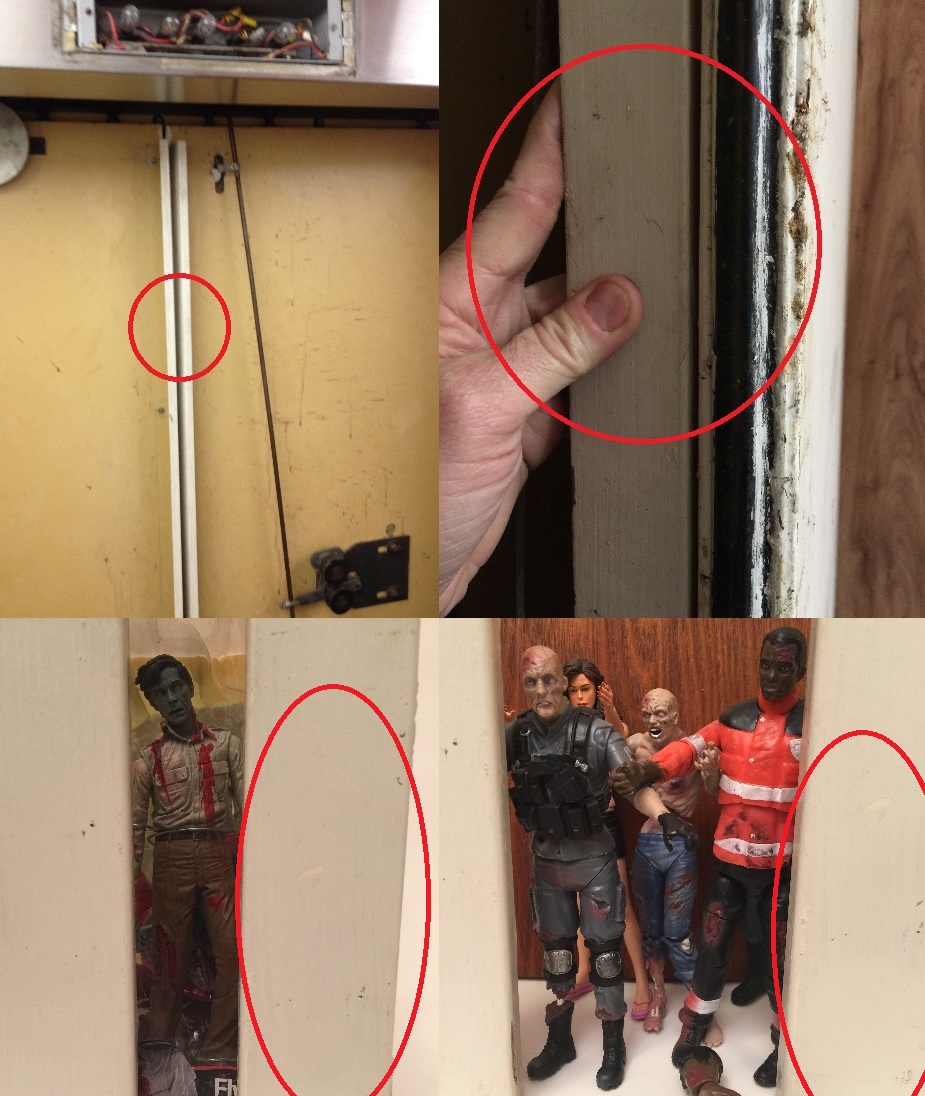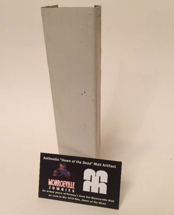 The climatic scene in Dawn of the Dead takes place in the JC Penney Elevator when the doors open to reveal Flyboy Zombie! Monroeville Zombies purchased and removed the actual elevator doors from JC Penney (inset picture) for a future exhibit in the zombie museum.The doors each have an inner edge that is visible in the film when the doors are shown open. The edge piece happens to be a width that is in scale if used as a door for the Dawn of the Dead 7 inch scale action figures. The edge piece has been cut to 7 1/2 inches long to also be in height scale as a door for action figures.