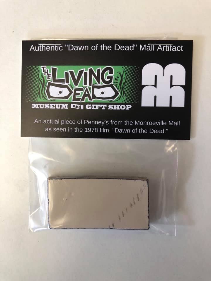 The JC Penney's Escalator, perhaps the world's most recognized escalator, made famous for its use in the 1978 film, "Dawn of the Dead." Now decommissioned and the whole Penney's store being demolished, this movie icon is no longer.Portions of the escalator have been purchased by The Living Dead Museum to create a tribute exhibit in the museum. Additional pieces of the escalator have been salvaged as collectible artifacts. For sale here is a bi-metal particle board composite piece from the inner side wall of the escalator. The piece comes in a collectible package with header card that includes a certificate of authenticity.