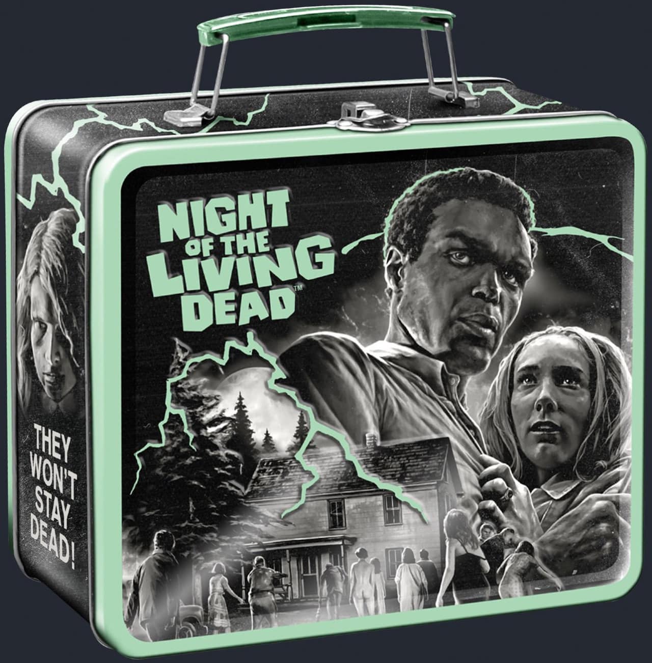 Officially Licensed! Real Metal Embossed Lunchbox and Thermos Drink Container Set.Original art based on the classic film, NIGHT OF THE LIVING DEAD is embossed on this metal lunchbox style tine carrier tote.