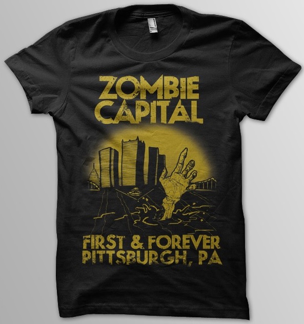 Pittsburgh is the Zombie Capital. Home of the FIRST zombie movie. Home of the FIRST Guinness World Record setting zombie walk. Other cities may try to copy with walks and zombie TV shows, but they would not exist without the city that started it all. Pittsburgh, PA is FIRST and FOREVER the Zombie Capital and this Black and muted Gold T-shirt will proudly proclaim that to all!Art by Jon Towers. Shirt is a black 100% Pre-Shrunk cotton with a muted gold screened logo.